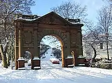 Given Sir George's view that statues were inappropriate memorials a group set out to find an alternative means of recognising his life. One proposal was to create a new stained glass window in St Giles Cathedral another was for an arch on Observatory Road at the entrance to Blackford Hill. The latter idea was adopted after a letter from Lord Rosebery, offering his "emphatic adhesion" to the idea, was published in The Scotsman on 2 August 1886. In 1888 the Harrison Arch in Observatory Road was built "to commemorate the work and character of Sir George Harrison". It is a red sandstone triumphal arch.[6] Two streets in Edinburgh — Harrison Road, and Harrison Gardens — were also named after him.[7]