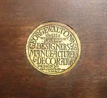 His father's death in 1873 left the family in straitened circumstances, and at the age of thirteen George started work as a clerk with the British Linen Bank. With a view to a different career, he attended art classes in the evenings at the Glasgow School of Art and with Peter McGregor Wilson (1856–1928) at the short-lived Glasgow Atelier of Fine Arts. When he was commissioned to redesign one of Miss Cranston's tea rooms at 114 Argyle Street in Glasgow, Walton started his own decorating company, George Walton & Co, Ecclesiastical and House Decorators, in 1888 at 152 Wellington Street.[2] The peacock became the firm’s emblem.[3] His arts and crafts style of decoration, including his woodblock printed wallpaper production, was influenced by William Morris[4] and included stencilling, a common technique in Scotland at this time, and highly decorated wall surfaces in floral patterns, in line with prevailing fashion and also influenced by Japanese pattern books reflecting Glasgow’s then active trade with Japan. He was also greatly influenced by James Whistler[5]