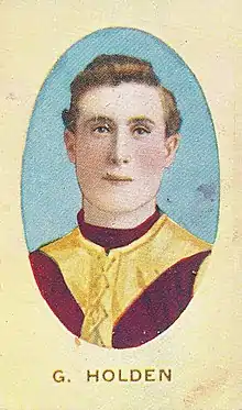 Holden was both a centreman and wingman during his career with Fitzroy, which began in 1908. He was club champion in his debut season, winning the best and fairest award for the second time in 1915. One of Fitzroy's best in their 1913 premiership,[1] Holden was named as the club's coach three years later and was a premiership player again in his first year in the role. He also captained the club in 1917 and 1918 while remaining coach but had to retire at the start of the 1919 season after suffering a serious knee injury.