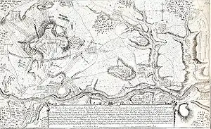 Howard commanded the 3rd Regiment of Foot again, under the Duke of Cumberland, at the Battle of Falkirk Muir in January 1746 and the Battle of Culloden in April 1746 during the Jacobite Rebellion and was accused of treating the defeated highlanders unduly harshly.[2] He then returned to the continent and fought at the Battle of Lauffeld in July 1747.[2] He succeeded his father as colonel of the 3rd Regiment of Foot in August 1749.[3] He went on to take part in the Raid on Rochefort in September 1757 and, having been promoted to major-general on 24 January 1758,[4] he commanded a brigade, under the Marquess of Granby, at the Battle of Warburg in July 1760 during the Seven Years' War.[3] He was promoted to lieutenant-general on 14 March 1761.[5]