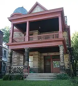 Built of limestone, the Hummel House is covered with a slate roof and features elements of granite.[2] It was built with an irregular and asymmetrical floor plan, including a prominent porch and a turret.[3]:5 The two-and-a-half-story facade is divided into three bays, with the turret on one of the corners; it dominates the appearance, with the two-story porch being the house's second most prominent feature. Uniformity is absent from the porch: ashlar was used for its first-story pillars, while the flat roof of the second story relies on spindled wooden columns and balustrade. Erected to be the home of George Hummel, the house features variety in its stonework: courses of small blocks alternate with courses of large blocks, while the foundation and water table are built of random stonework in multiple colors. These elements, together with the porch and turret, lend the house an eclectic appearance with influence from multiple styles common during the late Victorian period.[4]