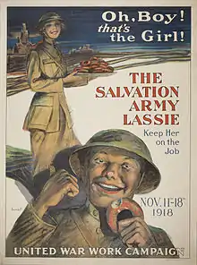 In 1918, Richards designed the World War I poster, "Oh, Boy! That's the Girl!" It was published by Sackett & Wihlems for The Salvation Army.[5] The poster features a woman holding plate of doughnuts and a "Doughboy" eating a donut. He urges viewers to keep the "Lassies" on the job by donating to The Salvation Army. Lassies were women of The Salvation Army who performed duties like writing letters home, praying over fallen soldiers, and making doughnuts for the soldiers.[6]