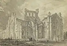 At the same time Kemp began an intense study of Gothic architecture. His job required much local travel and he sketched and studied the monastic churches of the area, such as Melrose, Dryburgh, Jedburgh and Kelso.[2][5][7] The abbey at Melrose was of great and lasting significance to Kemp; he returned to it repeatedly, and it became his most important inspiration for the Scott Monument. Kemp's method of looking at the architecture of a building was first to make a general study of it, then to carry out a few detailed sketches of decorative features. He did not draw plans there and then, but did so later, being able quickly to commit to memory the layout of a building and its intricacies.[5]