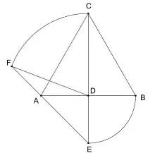 - Let A and B be midpoints of the sides EF and ED of an equilateral triangle DEF. Extend AB to meet the circumcircle (of DEF) at C. Show that B divides AC according to the golden section[3]