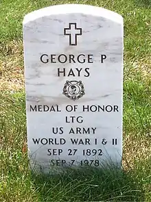 Hays was born on September 27, 1892, in China, where his parents worked as Presbyterian missionaries.[1][2] He was raised in El Reno, Oklahoma, and attended Oklahoma A&M College (now Oklahoma State University) before leaving school to enlist for World War I. He was commissioned a second lieutenant in 1917, and by July 14, 1918, was a first lieutenant serving in France with the 10th Field Artillery Regiment, 3rd Division. On that day, during the Second Battle of the Marne near Greves Farm, his unit came under a heavy German artillery barrage and the communication lines were destroyed. Despite the intense fire, Hays rode on horseback between his unit, the command post, and two French batteries for the rest of that day and the next. Although he was severely wounded and had seven horses shot out from under him, his efforts contributed to the halt of the German advance. For these actions, he was awarded the Medal of Honor the next year, in 1919.[1]