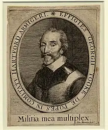 George Tooke, born in 1595, was the fifth son of Walter Tooke, by his wife Angelet(te) (died 1598), second daughter and coheiress of William Woodcliffe, a citizen and mercer of London.[1][2] In 1625 George took part in the unsuccessful expedition under Sir Edward Cecil against Cadiz.[1] He commanded a company of volunteers, and afterwards wrote an account of the undertaking, entitled The History of Cales Passion; or as some will by-name it, the Miss-taking of Cales presented in Vindication of the Sufferers, and to forewarne the future. By G. T. Esq., London, 1652, 4to.[1] The work, which is in prose and verse, is dedicated to 'his much honoured cousin Mr John Greaves'.[1] Another edition was published in 1654 with a print by Wenceslaus Hollar; and a third in 1659.[1] After the return of the expedition to Plymouth a severe mortality broke out on board the ships, and Tooke's health was so much impaired that he was eventually compelled to retire from military service.[1] He took up his residence on his paternal estate of Popes, near Hatfield in Hertfordshire, to which he succeeded on the death of his eldest brother Ralph on 22 December 1635.[1] There he enjoyed the intimacy of John Selden the jurist, of the 'ever-memorable' John Hales (1584–1656), and of his cousin, John Greaves, who dedicated to him in 1650 his Description of the Grand Signiors Seraglio.[3] Tooke died at Popes without issue in 1675.[4] He was twice married: first, to Anne, eldest daughter of Thomas Tooke of Bere Court, near Dover.[4] She died on 9 December 1642, and he married, secondly, Margery, daughter of Thomas Coningsbury of North Mimms, Hertfordshire.[4]