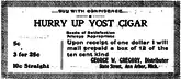 Advertisement for Hurry Up Yost Cigars, Geo. W. Gregory, Distributor