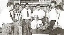 George Walther and his sons (John, Daniel, George Jr, Jacob, David, Jimmy, Dick) inspect a truck wheel to celebrate 50th Anniversary of Dayton Steel Foundry in 1955