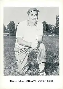 Wilson began his coaching career with the Bears in 1947, when he became an assistant coach to George Halas.[5] He spent just two seasons with Chicago, before taking an assistant coaching position in 1949 with the Detroit Lions, a division rival of the Bears.[6] Before the 1957 season began, he succeeded Buddy Parker as head coach, who abruptly resigned on August 12.[7] Wilson instituted an 11 p.m. curfew for his team while issuing $50 per hour fines for violators and doing bed checks at training camp. He described his manner as such: "I joke around a lot, but there's only one way to play football and that is to beat down the other guy."[8] The crackdown policy was modified to be tougher when the team had a middling run of preseason games, but it did not stop Wilson from having to bail out his quarterback Bobby Layne from an arrest on drunk driving in the middle of the night.