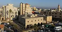 The Cathedral of Saint Thomas in Tyre with the seat of the archeparchy on the left hand side and the Catholic-Latin church of the Couvent de Terre Sainte on the right hand side