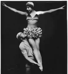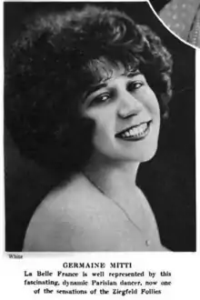 Germaine Mitti and her partner Eugene Tillio[4] appeared with the Ziegfeld Follies of 1921.[5][6] Their act was considered one of the show's highlights by reviewers, one of whom noted that "Mitti is a slight little woman with a sympathetic face and manner, and a lithe body, as full of grace and energy as a young panther."[7] She was part of the elaborate tableaux of stage designer Ben Ali Haggin,[8][9] and wore a costume so minimal it was said to fit "in the palm of her hand."[10]