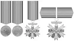 Of the three classes, the First Class was presented as a neck order. A total of 767 were presented. The second class was open to persons who played a significant, but lesser role as to the work which went into the presentation of the games. A total of 3,364 were awarded. The German Olympic Commemorative Medal (German: Deutsche Olympia-Erinnerungsmedaille) was established to recognize service in connection with the preparation work and execution of the game events. The medal was not restricted to German nationals. All classes could be worn miniaturized on a ribbon bar.[6] Modern German law prohibits the wearing of a swastika, so in 1957 the German federal government authorised replacement decorations in place of the swastika version; which still exists and can be worn as a civil decoration.[7]