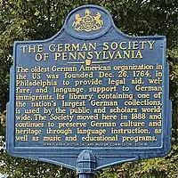 The German Society of Pennsylvania, located in the Northern Liberties neighborhood of Philadelphia, is the oldest German-culture organization in the United States. Founded in 1764, to aid German immigrants, including those who arrived as indentured servants, it now promotes the teaching of the German language and culture, sponsors lectures, concerts and films, and awards scholarships.[1] Its Joseph P. Horner Memorial Library is the largest private German-language library outside of Germany. The Library was founded in 1817 and throughout its history collected a wide variety of literature and periodicals to serve the reading interests of German Society members; it continues to operate as a lending library today, with a focus on fiction, biography, and children's books in German. In 1867, under the leadership of Oswald Seidensticker, an archive was established, with the aim of documenting German-American history and culture, and that remains the primary mission of the Library today. Among the holdings are many early products of the German-American press, including a 1743 Christoph Sauer Bible, the first European-language Bible printed in North America. As a research institution, the Horner Library is also known for its pamphlet and manuscript collections related to German-American organizations and individuals, and its holdings of 19th-century popular German works that have become rare.[2]