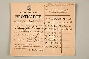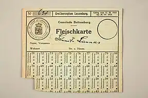 The most pressing concern of the Luxembourgish government was that of food supply.[34] The war had made importation of food an impossibility, and the needs of the German occupiers inevitably came before those of the Luxembourgish people.[35] To slow the food supply's diminishment, Michel Welter, the Director-General for both agriculture and commerce, banned the export of food from Luxembourg.[36] Furthermore, the government introduced rationing and price controls to counteract the soaring demand and to make food more affordable for poorer Luxembourgers. However, the measures did not have the desired effect. Increasing numbers of Luxembourgers turned to the black market,[34] and, to the consternation of the Luxembourgish government, the German army of occupation seemed to do little to help. Moreover, the government accused Germany of aiding the development of the black market by refusing to enforce regulations, and even of smuggling goods themselves.[35]