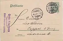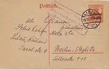 From 1900 onwards the Deutsche Reichspost issued several postal stationeries with imprinted Germania stamps.[10] The most common one is a ‘Postkarte’ (postcard) with an imprinted 5 Pfennig stamp. In 1916 the German government introduced a tax on the postal traffic, the Reichsabgabe. This involved a raising of the postal rates and the 5 Pfennig postcard was replaced by a 7½ Pfennig postcard. In 1918 the Reichsabgabe was raised. Now the 10 Pfennig postcard for international mail had to be used for domestic mail too.