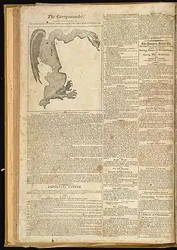 The word gerrymander (originally written "Gerry-mander") was used for the first time in the Boston-Gazette (not to be confused with the Boston Gazette) on March 26, 1812, in reaction to a redrawing of Massachusetts state senate election districts under the then-governor Elbridge Gerry (1744–1814), who signed a bill that redistricted Massachusetts to benefit his Democratic-Republican Party. When mapped, one of the contorted districts to the north of Boston was said to resemble the shape of a salamander.[7]