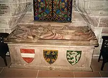 Gertrude died on 16 February 1281 at her husband's residence in Vienna. According to her will, she was buried in Basel Minster, alongside her youngest son Charles.[2] King Rudolf had been engaged in lengthy conflicts with the Prince-Bishops of Basel before his coronation, and Queen Anne wish to be buried in Basel provided him with an opportunity to mend ties with the citizens of Basel.[2] He gave his consent to the funeral in Basel which took place on March 20.[2] Her entrails were taken out and her body was filled with sand before the burial. Centuries later, her mortal remains were solemnly transferred to Saint Blaise Abbey in 1770; today they rest at Saint Paul's Abbey in Carinthia.