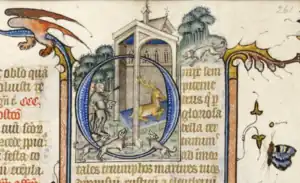 The Gesta is well known for its account of Dagobert's demise.[2] At the time of Dagobert's death, Bishop Ansoald of Poitiers was travelling on a diplomat mission when he stopped in Sicily to meet a famous hermit named John.[2][6] The hermit informed him that, on the very day of Dagobert's death and while he was praying for the king's soul, he had a vision of the king being escorted by black-coloured demons in a boat towards one of the active volcanoes in the Aeolian Islands. The king, however, called out to the saints to whom he had been generous all his life—Denis, Martin and Maurice—who appeared out of thunder and lightning to rescue Dagobert, taking him with them to the Bosom of Abraham.[2][6][17] The story of Dagobert's postmortem rescue probably owes something to the account in Gregory the Great's Dialogues of a hermit on Lipari who saw Theoderic the Great thrown into a volcano that led to Hell.[6]