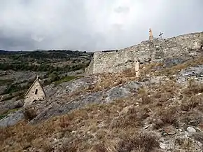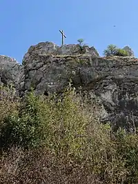 On the right, one can see the remains of the lowest fortification walls, of a water cistern, and of auxiliary buildings. Further up was the main building of the castle, with a floor plan measuring approximately 13 by 40 meters.[1] This building occupied the entire width of the ridge and its walls, which are still preserved, have an impressive thickness of up to 3 meters. Uphill there is a moat, which, on one hand, protected the castle building from above, and, on the other hand, represented an obstacle to attain the uppermost part of the castle. The uppermost part was dominated by a round tower. Today, only the remains of the tower walls are visible, and a cross has been erected on this spot. The tower was protected by additional walls and by another moat from above. This castle could be defended very well and was able to withstand sieges successfully.