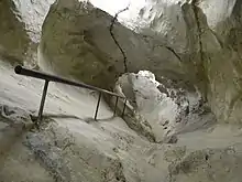 There are several legends about the Feschtiloch,[9] which are mostly similar, and therefore here only one variant: In the Feschtiloch there are three corridors, and in one of them there are three cauldrons of money. Each cauldron is guarded by a beast: the first by a poisonous snake, the second by a toad, and the third by a lion. On Christmas Eve you can take the money with you, but before that you must first kiss each of the beasts. But this must be done exactly during the consecration during the Holy Mass. In addition, the kettles are not easy to find, because they are only visible during the consecration too. Because of all these difficulties, it seems that nobody has been able to carry the kettles away yet, and they are probably still lying there.