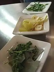 Vegetable side dishes in a Ghanaian restaurant including diced pineapple with sliced garlic and taro leaf salad.