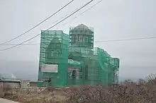 After the war, the Azerbaijani government announced a renovation of the cathedral in the frame of large-scale reconstruction work in Shusha. The renovation project attracted much attention and criticism, with many Armenians alleging that Azerbaijan was seeking to blot out the Armenian identity of the church by altering or obscuring its basic features and design elements.[74] In May 2021, footage released by CivilNet showed the conical dome of the church had been removed and the church itself surrounded by ostensible scaffolding.[75] A report by Caucasian Knot quoted several Azerbaijani state officials who claimed that the renovation project aimed to restore the "original" appearance of the church, which, according to them, lacked the conical dome until it was added by the Armenians following Shushi's capture in 1992.[76] However, the conical dome of the church can be seen in photographs from over a century ago.[77][74]