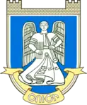 The sculpture of an angel on the bell tower of the cathedral (left) is depicted on the coat of arms of Shushi used during Armenian administration of Shusha (right).