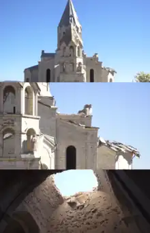 Shusha's Armenian minority was expelled from the city after the Nagorno-Karabakh conflict began in February 1988.[21] The cathedral was turned into an armory by Azerbaijan.[19] According to Armenian political analyst Levon Melik-Shahnazaryan, the cathedral was set on fire three times between 1988 and 1991 using car tires.[22] Azerbaijanis dismantled the stone statues of angels on the bell tower in 1989.[23] They reportedly sold off its bronze bell, which was later found in a market in Donetsk, Ukraine and was bought by an Armenian officer for three million rubles and returned to Armenia.[24] Prior to the fall of Shushi to the Armenians, Azerbaijani forces stored hundreds of boxes of BM-21 Grad missiles as the cathedral was safe from potential Armenian bombardment.[25][26][27] Shusha was used as a base for the shelling of Stepanakert, the largest city of Karabakh, with Grad launchers for several months.[28][29] Armenian volunteers, including noted activist Igor Muradyan, carried the wooden boxes of artillery and rocket shells out of the church immediately after the capture of the city.[30][31] The flag of Armenia was raised on top of the damaged dome by Armenian troops.[32] Melik-Shahnazaryan wrote that by the time of its capture "practically, only a stone skeleton had remained of the magnificent structure."[22] A foreign visitor noted that its "windows were missing but the interior was in reasonable condition."[31]