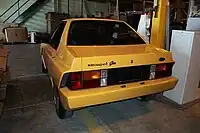 The working prototype was built in sheet aluminum on a Fiesta platform with the wheelbase shortened by 10 in (254 mm) and modified to house a new fuel tank shape with its capacity reduced to 20-25 litres. the design was of a "formal notchback" theme with an integrated rear spoiler for improved aerodynamics. The front features rectangular double sealed-beam headlights, possibly faired with transparent plastics, and federalized bumpers (the integrated front one with spoiler shape).[7]