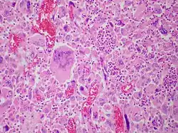 Under light microscopy, the giant malignant pleomorphic cells making up a GCCL resemble those found in choriocarcinoma,[1] angiosarcoma,[19] and some forms of true sarcoma,[1] such as malignant fibrous histiocytoma[1] and rhabdomyosarcoma.[9] In some instances, they can also bear considerable resemblance to "activated" histiocytes seen in some inflammatory conditions.[9]