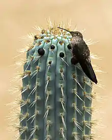 It regularly feeds from the flowers of the genus Puya in Chile, with which it enjoys a symbiotic relationship, trading pollination for food.[18][25] As a large hovering bird, particularly at high altitudes, the giant hummingbird has extremely high metabolic requirements. It is known to feed from columnar cacti, including Oreocereus celsianus and Echinopsis atacamensis ssp. pasacana, and Salvia haenkei.[21][26][27]
