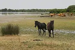 The surface of the Giara di Gesturi has a number of shallow depressions, Sardinian: paulis, some of which are deep enough to hold water year round; the largest of these is the Pauli Maiori (not to be confused with the Ramsar-designated Stagno di Pauli Maiori near Oristano). The soil of the plateau is shallow, rarely exceeding 50 cm (20 in) in depth. The Giara di Gesturi is home to over 350 plant species, notably the Cork oak,[1] and to the majority of the surviving population of the Giara Horse.[3]