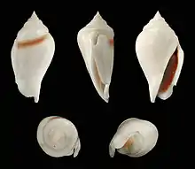 Five views of a shell of Gibberulus gibberulus Mörch, 1850