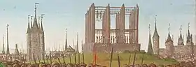 The Gibbet of Montfaucon (French: Gibet de Montfaucon) was the main gallows and gibbet of the Kings of France until the time of Louis XIII of France. It was used to execute criminals, often traitors, by hanging and to display their dead bodies as a warning to the population. It was a large structure located at the top of a small hill near the modern Place du Colonel Fabien in Paris, though during the Middle Ages it was outside the city walls and the surrounding area was mostly not built up, being occupied by institutions like the Hôpital Saint-Louis from 1607, and earlier the Convent of the Filles-Dieu[1] ("Daughters of God"), a home for 200 reformed prostitutes, and the leper colony of St Lazare.[2]