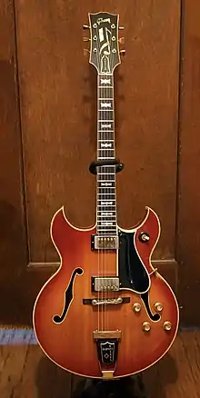The guitar was a hollow-body intended for Jazz music. The body featured a double cutaway design.[1] The guitar had a spruce top, maple sides and back, two Humbucker pickups, a mahogany neck and a Brazilian rosewood fretboard with double-parallelogram inlays on the regular version and bowtie inlays on the Custom model.[2] The custom was considered to be the deluxe version and it had more elaborate inlays and gold plated metal parts.[3]