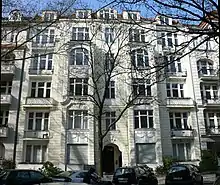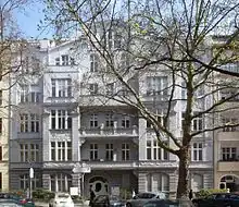 The building ensemble Giesebrechtstraße 5–8, 13-15 with the adjacent houses Clausewitzstraße 9 and Sybelstraße 64, located between Kurfürstendamm and Meyerinckplatz, was built between 1904 and 1906 and is today a listed "ensemble" as a group of tenement houses.[3] Buildings No. 3,[4] No. 6[5] and No. 20 [6] are listed as architectural monuments in the Berlin monument list. The corner building Giesebrechtstraße 9 / Kurfürstendamm 63 was destroyed during the Second World War and replaced by a new building. The opposite corner house, Giesebrechtstraße 10 / Kurfürstendamm 92, was also damaged but could be rebuilt. The other houses remained largely undamaged.