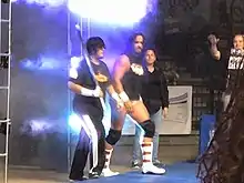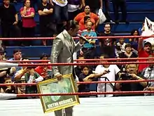 In April 2011, he entered a feud with Shane Sewell, from which he emerged with the Puerto Rico Heavyweight Championship.[14] Both wrestlers were included in a 4- man gauntlet match for the vacant Universal Heavyweight Championship, but were uninvolved in the outcome.[15] Eventually, Gilbert hosted Díaz, who after being attacked, decided to bring José Huertas González back from his retirement.[16] At Summer Madness 2011, he retained the championship, defeating World Wrestling Entertainment superstar, Eddie Colón[17] In this event the feud with Huertas González began official, with Gilbert attacking him with a folding chair.[18] An official match was scheduled for Aniversario 2011. In the meantime, Gilbert wrestled Díaz in grudge matches. The contract signing for Aniversario concluded in the revelation that José Laureano would be the special referee.[19] During the weeks leading to the event, Gilbert's push continued, with him defeating members of the midcard while receiving assistance from Laureano. The contest was heavily promoted by WWC, with both wrestlers making appearances in television and radio stations.[20][21] The first contest between them took place in a tag team match, where Huertas González and Díaz won by pinning Gilbert's partner, Laureano.[22] The main match between both was left inconclusive, seeing intervention from Huertas González's family.[23]