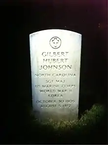 Sergeant Major Gilbert "Hashmark" Johnson (October 30, 1905 – August 5, 1972) was one of the first African Americans to enlist in the United States Marine Corps and one of the first African American drill instructors in the Marine Corps. Johnson was known as “Hashmark” because he had more service stripes than rank stripes. He retired in 1959 after 32 years of service in the U.S. armed forces, including 17 years as a Marine.
