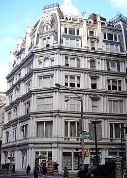 Gilsey House was designed by Stephen Decatur Hatch for Peter Gilsey, a Danish immigrant merchant and city alderman[2] who leased[2] the plot – which included the grounds of the St. George Cricket Club – from Caspar Samlar for $10,000 a year.[2][3][4][1] It was constructed from 1869 to 1871 at the cost of $350,000,[1] opening as the Gilsey House Hotel in 1872.[4][5] The cast-iron for the facade of the Second Empire style building was fabricated by Daniel D. Badger,[3][1] a significant and influential advocate for cast-iron architecture at the time;[2] the extent to which Badger contributed to the design of the facade is unknown.[1]