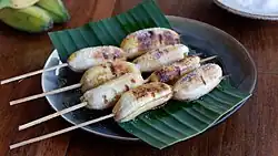 Ginanggang, guinanggang, or ginang-gang (Cebuano pronunciation: [ginaŋ'gaŋ]) is a snack food of grilled skewered bananas brushed with margarine and sprinkled with sugar. It originates from the island of Mindanao in the Philippines.[1] It literally means "grilled" in Cebuano.[2]