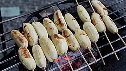 Ginanggang is made from a type of banana in the Philippines called saba (a cooking banana also known as the Cardaba banana). The banana is peeled, skewered and then grilled over charcoals. When the outer surface is lightly charred, it is then taken off the grill, brushed with margarine, and sprinkled with sugar. It differs from banana cue in that riper saba bananas are preferred; the banana is actually grilled on the stick instead of being fried and skewered later, and the sugar used is white table sugar and is not caramelized (being applied after cooking).[3][4]