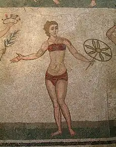 In 1959–60, Gino Vinicio Gentili excavated a mosaic on the floor of the room, later dubbed the "Chamber of the Ten Maidens", at the Villa Romana del Casale near Piazza Armerina. Informally called "the bikini girls", the maidens appear in a mosaic artwork which scholars named "Coronation of the Winner". The young women perform sports including weight-lifting, discus throwing, running and ball-games. A woman in a rich dress is depicted with a crown in her hand; one of the maidens holds a palm frond. The Villa in 1997 became a UNESCO World Heritage Site.