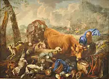 Castiglione was famous for his ability to paint animals, mostly farm animals, and they were often a dominant motif in his paintings. For example, in the painting of Jesus clearing the temple of Moneylenders, the religious event is a minor, background part of the painting, the stampede of animals is far more prominent than the scattering of bankers. Castiglione's attention to detail in the depiction of nature is regarded as proof of the influence of Scorza and the Flemish still life and animal painter Jan Roos who was a long-term resident of Genoa.[7] It has been suggested that it was Jan Roos who convinced Castiglione to enliven his religious and mythological compositions with animal and still-life elements.[8]