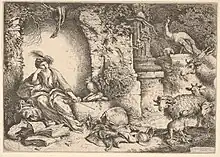 In Mantua, he received his name of Grechetto, from the classic air of his pastoral depictions. In his later years, he was severely afflicted by gout.[9] His brother Salvatore and his son Francesco excelled in the same subjects; and it is thought that many paintings which are ascribed to Benedetto are only copies after him, or perhaps originals by his son or brother.[3][10] He also influenced Anton Maria Vassallo (c1640-60).[11] Among those who engraved after him were Giovanni Lorenzo Bertolotto in Genoa,[12] the Venetian Anton Maria Zanetti, Michele l'Asne, Louis de Chatillon, and Coreneille Coemans.[13]