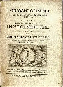 1. 1 2 3 4 One or more of the preceding sentences incorporates text from a publication now in the public domain: Chisholm, Hugh, ed. (1911). "Crescimbeni, Giovanni Mario". Encyclopædia Britannica. Vol. 7 (11th ed.). Cambridge University Press. pp. 411–412.