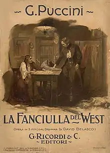 Palanti continued to design and illustrate the covers of sales catalogues for Milanese department stores from 1901 to 1912, working for the Italian Cooperative Union. From 1902, he began working with the Teatro alla Scala as a costume and set designer, as well as designing advertising posters until 1916.[1] His work included among other things design for the first performance of Madame Butterfly by Giacomo Puccini in 1904.[5] He also provided set and costume design for the 1905–06 opera season including The Marriage of Figaro and the La Dama di Picche; Simon Boccanegra in 1910–11, Romeo and Juliet and L'Armida; Don Carlos in 1912; Oberon in 1913; and La Battaglia di Legnano in 1916. He produced notable posters for performances of La fanciulla del West (1911), Isabeau (1912), and Parsifal (1914).[1] In 1907 he became adjunct professor at the Academy's School of Ornament and at the Higher School of Applied Art to Industry (Scuola superiore d'Arte Applicata all'Industria) and from 1913 he replaced Ludovico Pogliaghi in the special decoration school at the Brera Academy. In 1902, he collaborated with the architect Gaetano Moretti to design furniture which was presented in Turin, and later in 1907 his work was used to decorate the Palazzo di Giustizia.[6] In 1906, he was asked to design a series of postcards for the Milan International World Fair.[7] He would go on to participate in both the Centennial International Exposition in Buenos Aires, decorating the façade of the Italian pavilion, and the Brussels International Exposition decorating the ceiling the Italian pavilion in 1910.
