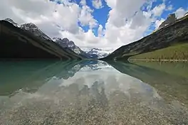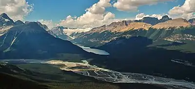Glacier Lake was named by Sir James Hector of the Palliser expedition in 1858 for the fact the lake is fed from glaciers, specifically the glaciers of the Lyell and Mons Icefields[2] as well as the Forbes North Glacier. The lake is surrounded by Mount Outram, Division Mountain, Mount Erasmus and Survey Peak. The lake is fed and discharged by the Glacier River, which is a tributary of the Howse River. The lake can be accessed via a 8.9 kilometres (5.5 miles) trail which starts near Saskatchewan River Crossing along the Icefields Parkway.[3] Park at the Glacier Lake trailhead (at the end of a short unnamed road 1.1 km (0.7 mi) west of the David Thompson Highway turn-off).