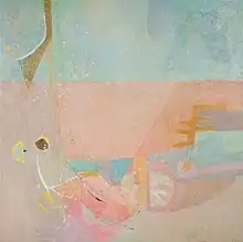 At the end of that year she organized a show designed to sell paintings based on size rather than artistic value and priced low enough to be purchased as holiday gifts. The objective, she said, was to enable local citizens "to acquire an appreciation of original pictures by contemporary artists." The painting that she offered for sale was a departure from her earlier work. Called "Tree and Pink Sky," it was entirely abstract.[7] She later said her transition from realist portraits to nature-derived abstractions was sudden and complete, but a fellow artist and art instructor, James G.A. Murphy, said that she continued to make portraits for private sale, but would only exhibit her abstract work.[1][8]