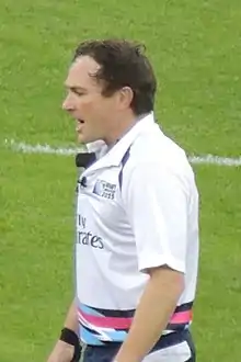 In 2010 Jackson retired to become a professional referee in his native New Zealand. He was fast-tracked into the professional rugby ranks by Lyndon Bray, then the head of referees for the New Zealand Rugby Union (now known as New Zealand Rugby) and later in the same role with SANZAAR, organiser of Super Rugby and The Rugby Championship (formerly the Tri Nations).[8] Within a year of Jackson's return to New Zealand, he went from refereeing provincial rugby games in the Heartland Championship to officiating in the ITM Cup at the top provincial level to being an assistant referee in Super Rugby competition.[8] By the end of the 2011 Super Rugby season, he had worked his first match as referee in that competition, having presided over the HurricanesWestern Force match on 27 May.[9] Shortly after the end of that season, he made his international officiating debut as television match official for the Bledisloe Cup Test between New Zealand and Australia on 6 August.[9] On 15 February 2015 he made his Six Nations refereeing debut when he took charge of the Scotland-Wales match at Murrayfield.[10][11] Jackson was the first New Zealander to play and referee 100 first class fixtures when he took charge of the Argentina v South Africa match on 15 August 2015. He retired as a referee after he was not selected for the 2019 Rugby World Cup.[12]