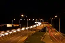 Beginning in 2005, the causeway carrying Glenmore Trail over the reservoir was extensively upgraded as part of a $57 million project that was completed in 2008.[5] Prior to the improvements, seven lanes (three eastbound and four westbound) crossed the reservoir.[6] The improvements saw construction of a new bridge carrying two lanes from northbound 14 Street SW to westbound Glenmore Trail, and reconstruction of the existing bridge carrying westbound Glenmore Trail. Construction was staggered and planned to minimize disruption to existing traffic. Nine total lanes crossed the reservoir at the completion of the project.